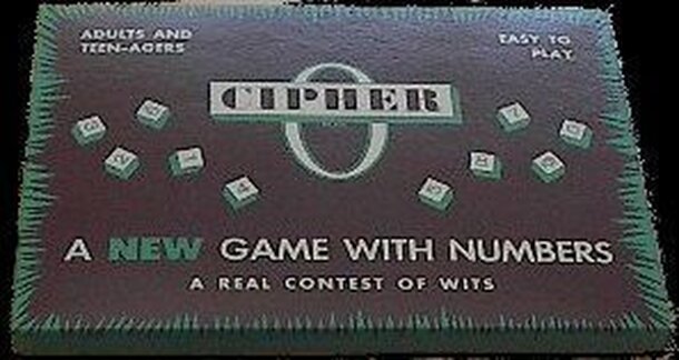 Cipher - "A New game with Numbers" - "A real contest of wits" This game uses an acetate scoring area and crayons so that the scoring area can be used repeatedly. In a two player game one player plays for even numbers and the other player plays for odd numbers. Blocks are turned up and plugged into an evolving equation with numbers of the appropriate...