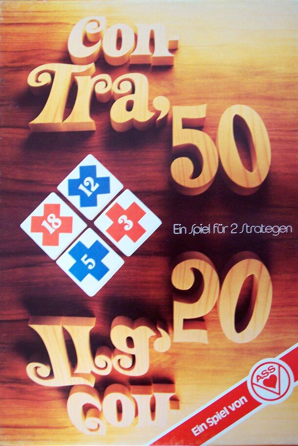 Versus 50 - an abstract board game in which players try to reduce their opponent's pieces to below a total value of 50. The board is a 12x12 checkerboard with some squares marked as barriers which cannot be crossed. The player's pieces are marked with numbers from 3 to 24 and with orthogonal or diagonal crosses, which indicate the direction they may move....