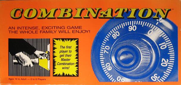 From the rules: "Combination is a game based on the binary numbering system for 2 to 6 players. It is extremely fast moving and action packed. Anyone who can add and subtract will readily enjoy this high-tech game of the 21st century." This game has a safecracking theme, but it consists mainly of racing to mentally convert decimal to binary, collecting...