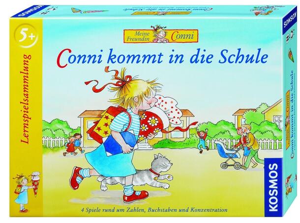 A game collection with 4 learning games, age 5-7. Common gameplay: The player rolls a die, moves the Conni figure that number of spaces on the board, and tries to solve the task on the target space. If he succeeds, he gets a part of a "Schultüte" (First-Day-Of-School-Surprise-Bag). The player(s) who first collect all 5 pieces win the game. The tasks are...