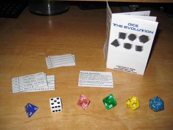 From the game's rules: This is a game designed to be fun. You have dice, you’re going to play with them anyway. Now you have a goal. Make dice towers, roll high numbers, spin dice, and evolve. Players start out with the d4, and fight their way up through the evolutionary chain of dice; d4 -> d6 -> d8 -> d10 -> d12 -> d20 The game is made up of two...