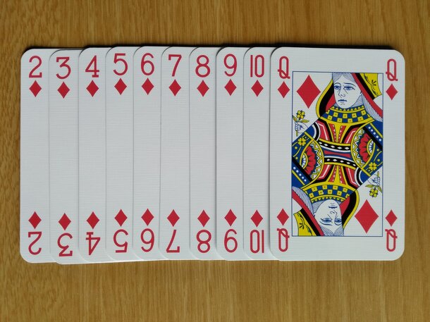 Claude Soucie's minimalist card game of outsmarting the opponent. A small deck of 10 cards is dealt to two players. One card per player is put face down then revealed. The higher card wins, unless the smaller card divides it evenly, or is one less than the higher. After five tricks the hands are swapped and played again. Whoever takes the most tricks wins....