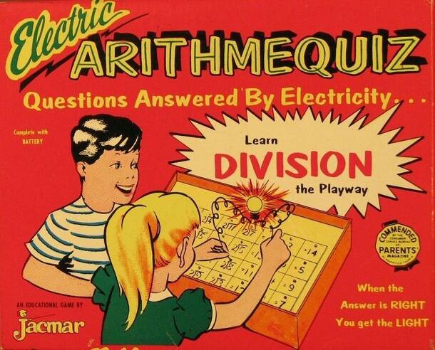 Childrens game to help increase their math division skills. A sheet of sums are provided. The player can attempt one and press their answer attempt. When you are correct the right answer lights up. Any number can play and, I guess, the one who gets the most right answers, wins. The box is determined to make a parent buy the game. It says: Commended by...