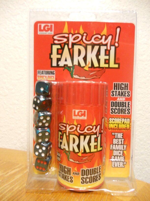 This is a newer, advanced farkel. Instead of regular dice, included are "spicy" dice. Each of the six die has one side where the pips are red, and they alternate on each dice. When a red side is rolled it doubles your score. Plus this game's rules indicate that you play high stakes, where any dice left unrolled by a player, can be rolled by the next...