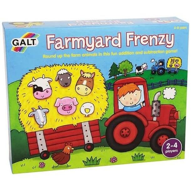 Galt's Farmyard Frenzy Game is a fun counting game that introduces young children to adding and subtracting. Drive around the farmyard in your tractor, picking up and dropping off animals according to the roll of the dice. Includes 4 tractor and trailer playing boards, 4 tractor counters and stands, 42 animal tokens, farmyard game board, dice, shaker and...