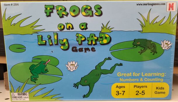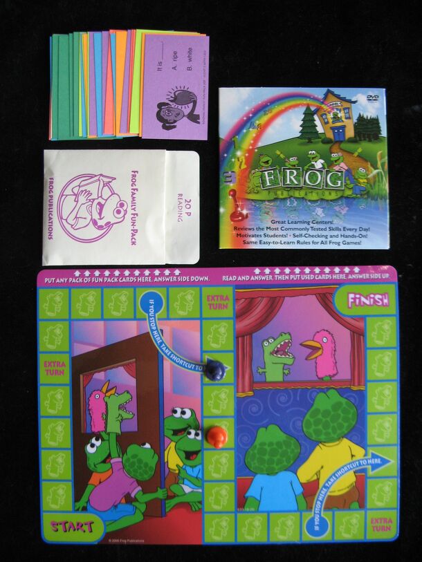 Frog Family Fun-Pack is an educational game for children, with various math and reading modules, all using the same rules and board. Players take turns choosing a card and attempting to answer the question on the card. If the answer is correct, they move their pawn on a track the number or spaces printed on the back of the card. If the answer is wrong, the...