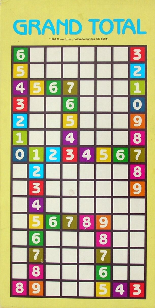 Grand Total is "Mathematical Equation Scrabble." Players place number and symbol tiles in a line to form an equation, scoring points for the number they use. The board is large (18" square), colorful, and well-designed. It is ruled off in 1" squares, with numbers from 0 to 9 printed in about 10% of the squares. The tiles are cardboard counters of decent...