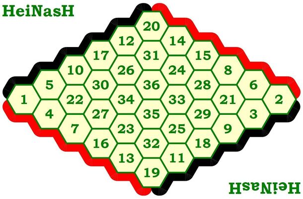 HeiNasH is a connection game with some luck. Two players try to connect their sides with pawns, as in Hex game. The board is made of hexes with numbers from 1 to 36. The player roll three dice. He has now to create a number with the 3 results. If he find a solution, he places one pawn on the number found. If he doesn't find any solution, his opponent can...