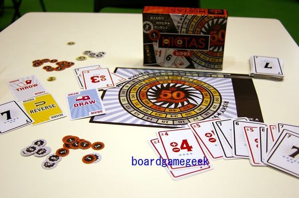 Hictas is a card game with the aim of moving the marker on the board to the 50 goal zone. The 46 numbered cards are numbered 1-10, and there are two each of the Special cards, Skip, Reverse, Draw and Throw (Uno-like actions, with the Throw card forcing the next player to discard a card instead of having a turn). The cards 1 to 5 give the player the option...