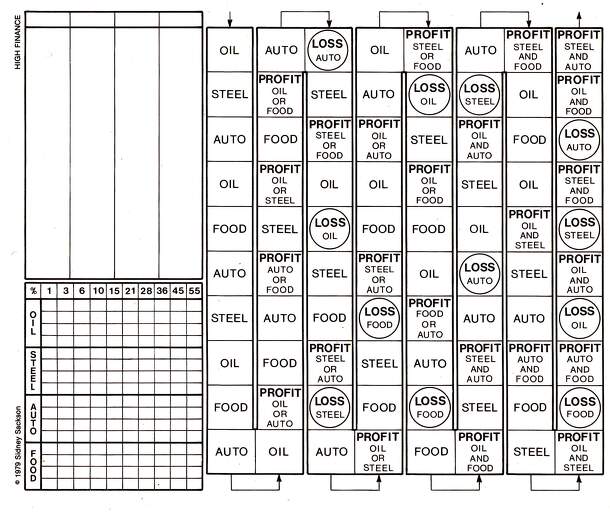 High Finance is one of six pencil and paper games described in the Sid Sackson book, Calculate! . Players advance through a series of game spaces and record the impact on their Net Worth according to the type of space they land on. If the space simply designates one of four industries (Oil, Steel, Auto, and Food), then the player has gained control of one...