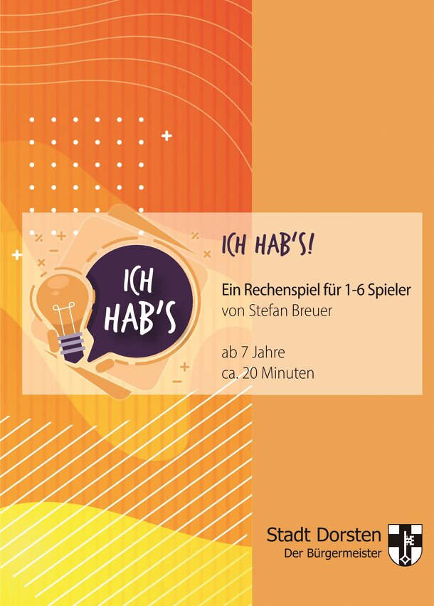 Ich hab's! is a fast counting game. Players have to find a counting way to the number of a rolled d20. You can play fast and at the samne time or you play slowly one after another. You can get to counting with fun. This game was designed by Stefan Breuer, who is the head of youth welfare in the town of Dorsten. The Major of Dorsten has published it free...