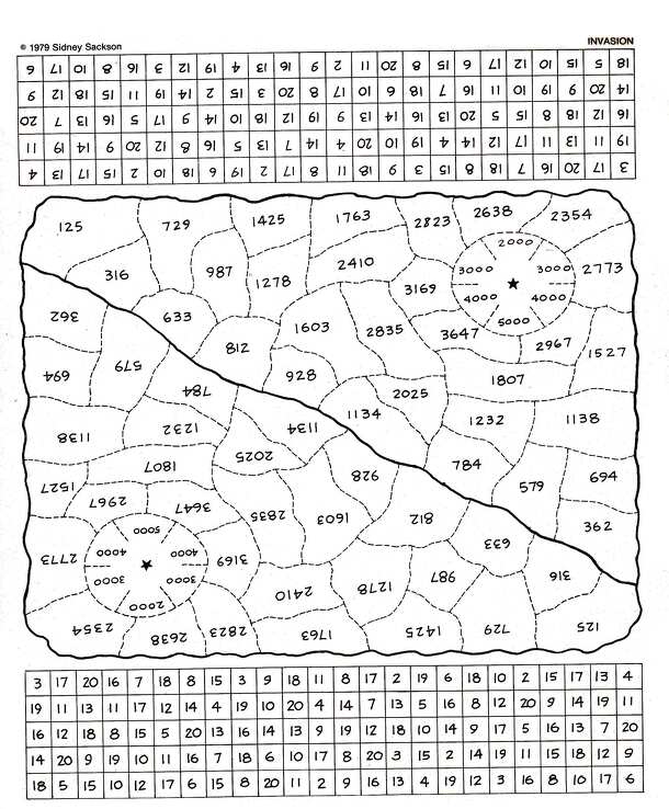 Described in the book Calculate!, Invasion is a game where players try to capture regions forming a path to the opponent's capital. Each region has a number on it, increasing in value the closer to the capital. Play alternates between attacking and defending. The attacker selects a region in the opponent's country that borders either the common border or...