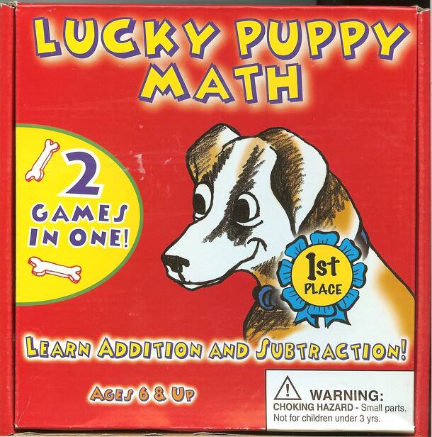 This game has a two sided board. On one side there is a version of Snakes and Ladders called Blue Ribbon Pooch in which players use dogs as tokens, and use two numerical dice and one operations dice to add or subtract before moving their token. Hence, players must perform the required mathematical operations in order to move their token. On the other side...