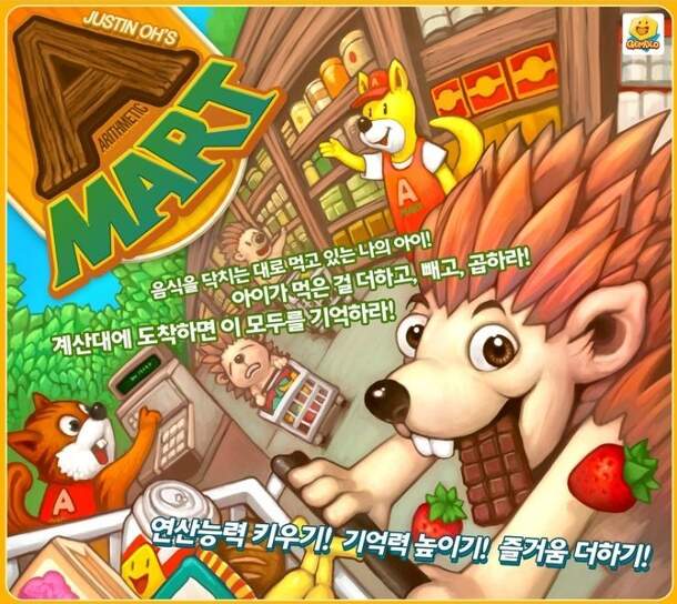 A-Mart – subtitled Arithmetic Mart – has you shopping for food in the supermarket, but your goal is not to grab all the food that you can, but rather to remember how much food you actually bought. Oh, and you're a porcupine. All players start at the entrance of the supermarket. On a turn, you roll the die, move that many spaces on the track, then take 1-2...