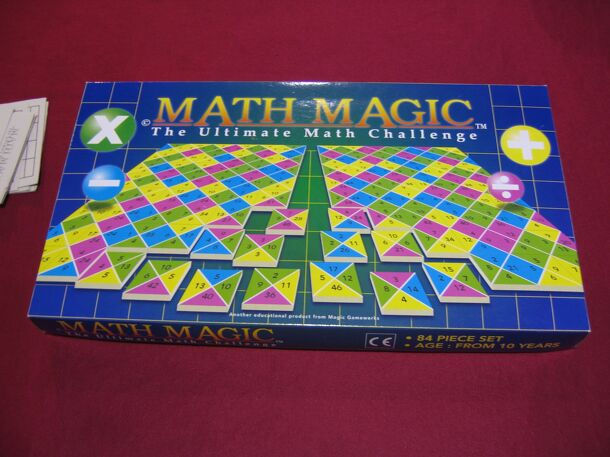 Math Magic A strategic board game which echoes a domino style format. Each tile is sectioned into quarter, colored triangles, with each color representing a math operation. Red for division, green for multiplication, blue for subtraction and yellow for addition. Players, in turn, match a tile to an existing one, trying to outsource their opponent. While...
