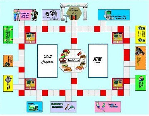 Educational math-game Object of the Game: The first player to make a purchase from each of the 12 stores and exit the mall wins. If time runs out the player with the most purchases wins. Contents: * Math Mall game board * 4 game pieces (erasers) * 50 Question Cards for each store (600 total) . * 1 calculator * 100 Mall Coupons, 50 Food Court Cards, 50 ATM...