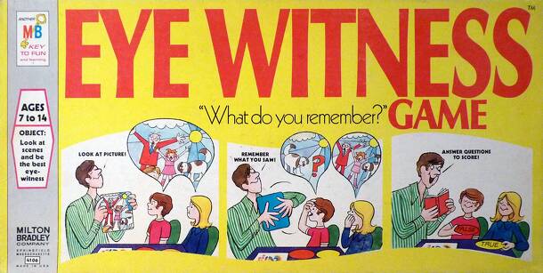 Eye-Witness is a memory and bluffing game where a scene is presented on the board, modified by overlaying game cards, and then players vote and bluff on which and how many details they can remember. The theme revolves around a bank-robbery in a downtown setting. Pieces: 1 x board 72 x red picture cards 72 x green picture cards 24 x witness statement cards...