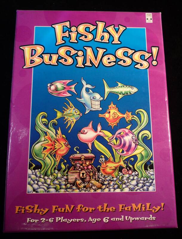 From the box: "A fabulously funny game of tropical fish trading! Mr Plankton runs a crazy shop called Fishy Business. You've got to help him sell his weird and wonderful tropical fish, in particular the Outer Mongolian Mackerel, the Fantastic Finnish Flounder, the Brazilian Balloon Bloater and the Poisonous Tiger Trout. Don't forget your fishing net!" The...