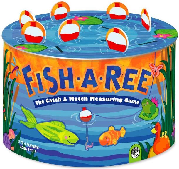 Time to fish, but you're rewarded only when you catch the right pair of fish so pay attention to who's swimming where - and stay away from the boot! To set up Fish-a-Ree, players must first open the game board, then set it on top of the game cannister. Then insert the ten fish tiles and two boot tiles into the dozen slots on the game board. On a turn, a...