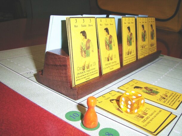Go Forward Rugby uses a rack and card system. The rack slides up and down the field Board to show where play currently is. If the rack moves past the Try Line at either end of the field a Try (Touch down) is scored. Players hold cards in their hands which they use to influence play in the rack. The Cards represent players on the field and special actions...