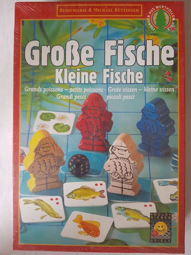 An angling game for younger players. A field of 48 tiles is laid out, and players roll the dice to move their angler in one direction of their choice (left,right up or down). When a player lands on a tile, the player takes and looks at the tile -- if it is a card with red dots , the player keeps it, but if it's a small fish (without dots in the corner) the...