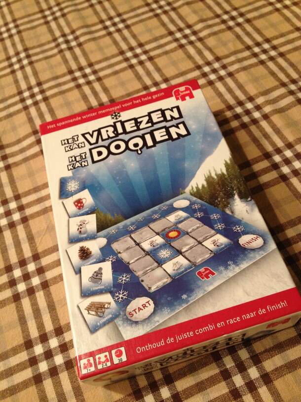 Translation from Dutch: Freezing, thawning. This game is a variant on Memory. Players flip over two cards. If those cards both have the same picture, then you may move you pawn a number of spaces like indicated on the cards. After turning over a duo of cards, put a token on one of the cards. This card cannot be turned over again until the token is removed....