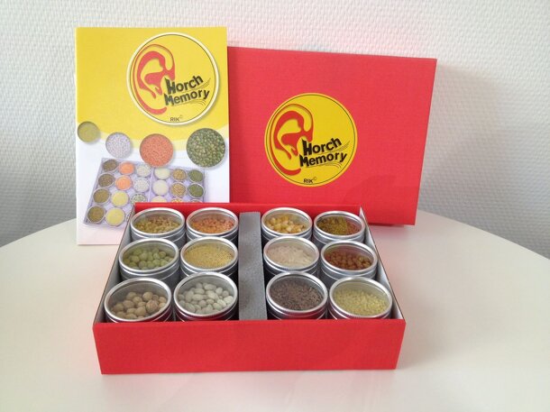 Pick up two of the face-down tin cans, shake each one. If the sounds are identical, you have a matching pair, keep it, and search for the next pair. The 12 pairs of tin cans have transparent covers, each pair contains different seeds of different size, weight (and color, though the latter does not play a big role here – one could use it also as a standard...