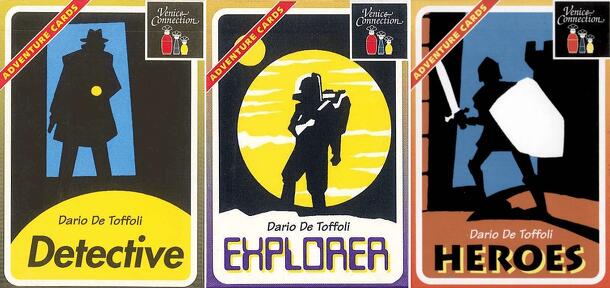 In the Adventure Card series, players are trying to collect sets ala "Go Fish" but adds a memory and meld element. There are two 24-card decks each with 6 cards of 4 colors each. One deck is separated by color and then used to form six four-card melds containing one card of each color. The second deck is dealt to each player plus one blind hand dealt face...