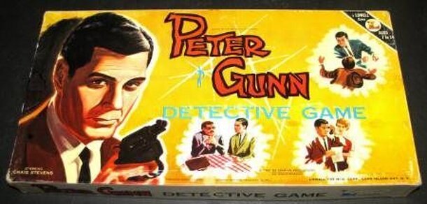 The Peter Gunn Detective Game is based on the highly successful Peter Gunn Television series from the early 1960's. Craig Stevens' character features prominently on the box of this licensed board game for kids 7-14. Each player takes a piece and start in the center of the board. A face-down person (Mr. Aay, Mr. Bee, Mr. Cee, Mr. Dee) and a face-down weapon...