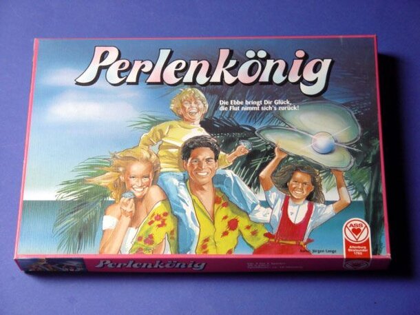 "Pearl King" The game contents are: 7 board tiles (one side display "water", the other "beach") 80 oysters counters (40 have pearls) 12 pearl cards (1 with a little crown) 1 special die (4 sides: oyster, 1 side: moon, 1 side: oyster with arrows) The players try to find pearls on the beach. The 7 board tiles are laid out in such a way, that 5 tiles show...