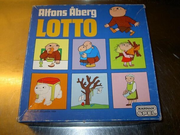Alfons Åberg Lotto are two games. One is a game where you get a tile with Alfons Åberg figures, and you should match the tiles you turn up on the table with your tile. The first to complete the tile is the winner. The other game is more a memory game where you should try to collect the figures that is on your tile. A mix game between memory and bingo. The...