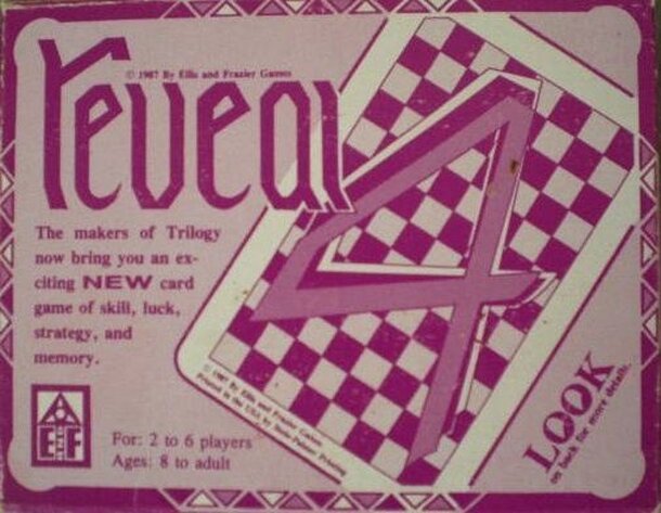 From the box: "The makers of Trilogy now bring you an exciting NEW card game of skill, luck, strategy, and memory. Reveal 4 is a fast moving battle of memories in which individuals or teams match mind power to see who can be the first to "Reveal 4." Watch out! Just when you think you are about to win, your opponent can cunningly pull the rug out from under...