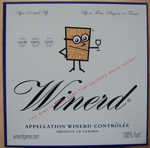 Winerd is a wine tasting game developed to educate players about wine. The players provide 3 different bottles of red or white wines. Play begins with each player (or team) tasting the 3 wines and taking notes about the wine's color, smell, and taste as well as noting the wine's name, vintage, and region of origins. Each turn, players draw a trivia card...