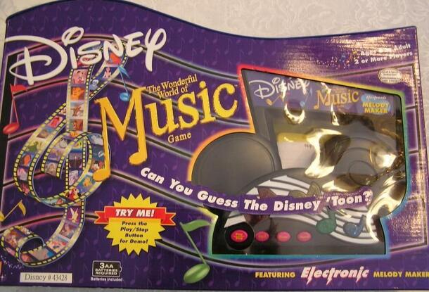 Name that Disney tune from a toon. Electronic gizmo plays Disney songs and players not only name the tune, but name the toon it came from or answer other related questions. Team one picks a card and reads the easy side for kids or the hard side for adults. The card gives a pattern to punch into the gizmo, which will play a Disney tune. Team two now tries...