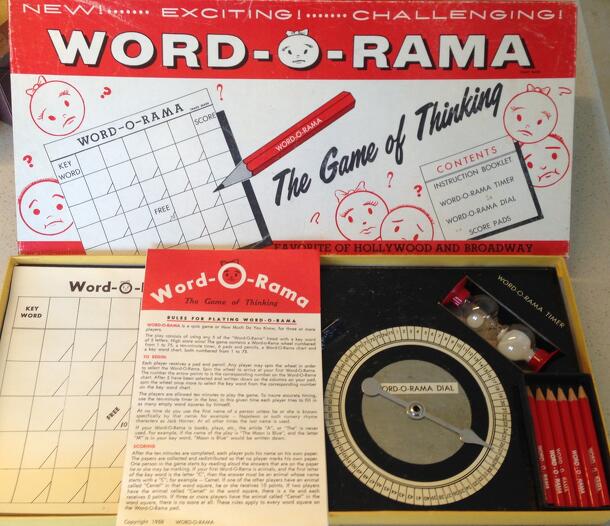 Word-O-Rama is a quiz or knowledge game for 3 or more players. Each player receives a pencil and a large pad printed with a 5x5 square. Like a bingo card, it has a "free" square in the middle, but there are spaces to the left for a vertical five-letter keyword, on top for 5 categories, and on the right for scoring. The game box contains a spinner that goes...