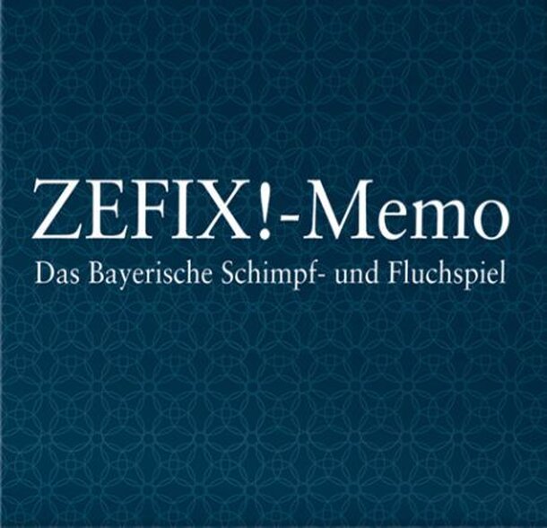 ZEFIX!-Memo is similar to Memory in that the game is played with tiles, which come in pairs, and on a turn a player flips two tiles – keeping them if they match and returning them face-down if they don't. What's different is that the tile pairs don't have identical images, but rather one tile features a choice Bavarian insult and the other depicts this...
