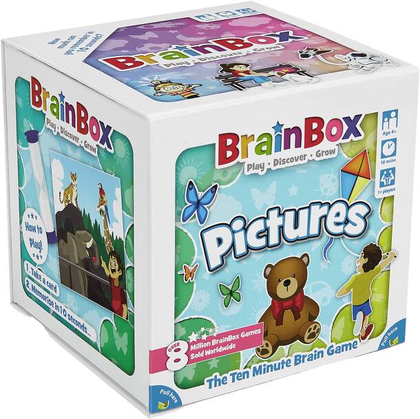 The object of the game is to win as many cards as possible in ten minutes. The first player takes a card from the Brainbox and turns the timer over. The player then has ten seconds to study the picture on the card. When the timer runs out the card is passed to player two and player one rolls the die to see which question is to be asked. The questions are...
