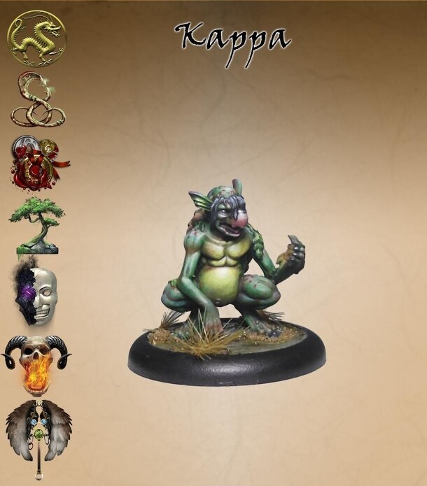 The Kappa are one of the most well-known of the Yokai, a selfish entitiy who will align with any for the price of a unique named gift. They’re bonded to water and if the gift is suitable can be convinced to turn their powers over the element to create swamp ground to impede enemies by concentrating their will. In combat the Kappa can be strangely strong...