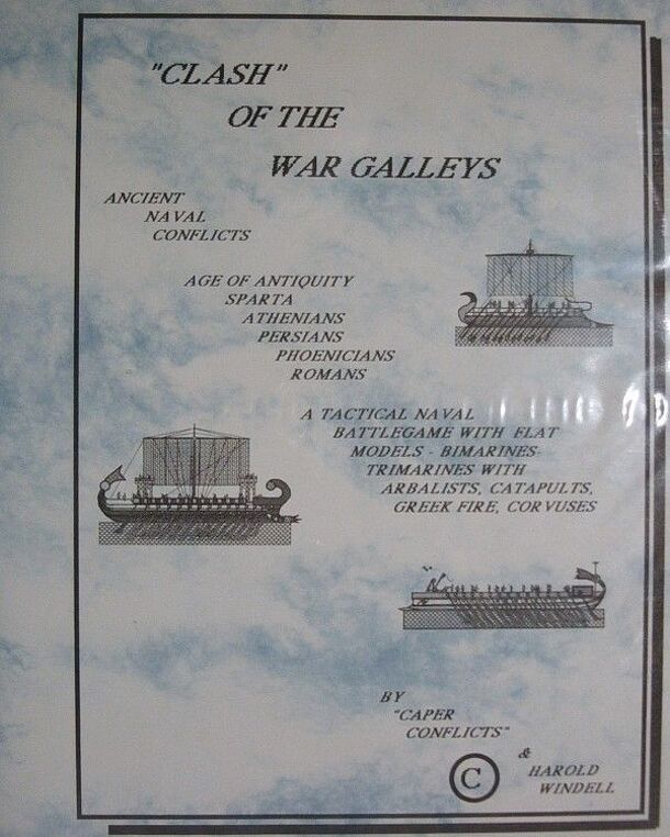 Ancient naval conflicts during the Age of Antiquity (Sparta, Athenians, Persians, Phoenicians, Romans). This is a tactical naval battle game with flat models - Bimarines and Trimarines with arbalists, catapults, Greek Fire, and corvuses. The game appears to come with only one scenario. Instructions are provided on how to construct the paper ships (coloring...