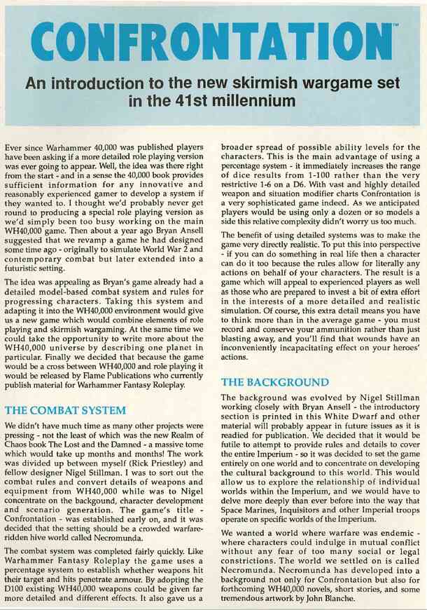 Confrontation was the name given to the original Warhammer 40,000: Rogue Trader skirmish game set on Necromunda in which gangs fought against each other, and attempted to increase their prestige and equipment. The game was published over a number of issues of White Dwarf, starting with Issue 130, and with the last installment in Issue 142. The mechanics...
