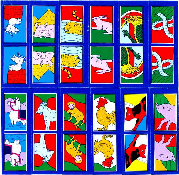 This is a traditional card game from the southern parts of Taiwan and Penghu County. The game uses 10 sets of 12 cards depicting the 12 Chinese zodiacs, namely the Rat, Ox, Tiger, Rabbit, Dragon, Snake, Horse, Goat, Monkey, Rooster, Dog and Pig. Players are dealt 11 cards each, with the banker dealt an extra card. The goal of the game is to form sets of 3...