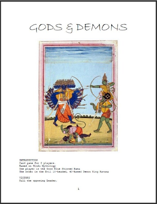“Card game for 2 players. Based on Hindu Mythology. One player is the Good Blue Skinned Rama. The other is the Evil 10-headed, 40-Armed Demon King Ravana. Victory: Kill the opposing Leader.” Each player has a unique deck containing, in addition to one Leader card, eight basic card types: Heroes, Troops, Weapons, Armor, Modifiers, Strikes, Defenses, and...