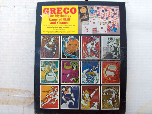 The Mythology Game of Skill and Chance Greco is a Mythology Bingo game. It is a learning/Bingo set put out by The Perfection Form Company of Logan, Iowa. A caller calls out a revealed piece, and in order to claim placement of the mythological character, you have to match it to the trivia blurb on your card. Greco is pronounced with a long 'e', e.g....