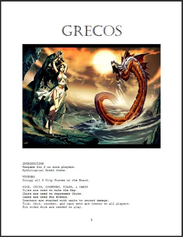 “Wargame for 2 or more players. Mythological Greek theme. Victory: Occupy all 6 City States on the Board.” “Tiles are used to make the Map. Chits are used to represent Units. Cards are used for Events. Counters are stacked with units to record damage. Tile, chit, counter, and card sets are common to all players. Six sided dice are needed to play.” The map...