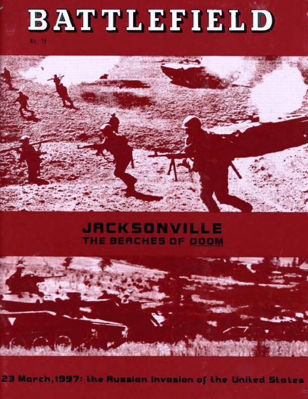 Jacksonville: the Beaches of Doom is a hypothetical "what if?" depiction of an invasion of the USA. in 1997, following a major War in Europe by about 15 years, according to the game description. Published in JagdPanther magazine which was renamed BATTLEFIELD as of this issue #15, OCT 1976. This was also the final issue of the magazine. Game Equipment...