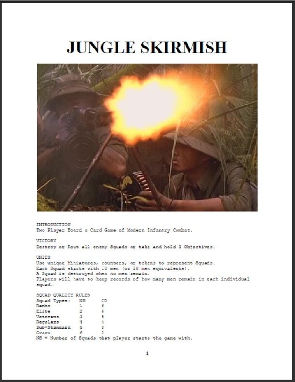“Two Player Board & Card Game of Modern Infantry Combat.” One player controls the Rebel Troops and the other player controls the Government Troops. The game is played on a chessboard or any other 8x8 grid. Squares are marked for terrain type and three squares are marked as Objectives. Each player starts with six Squads which are represented by miniatures...