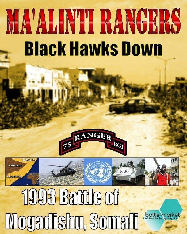 "This game simulates the 1993 Battle of Mogadishu (Ma'alinti Rangers - The day of the Rangers - in Somali). The game is designed for solo play, the player controlling the U.S. and U.N. forces involved in the battle, while the game system simulates the Somali defenders." The game comes with an historical article, rules, an A4-size map of the Mogadishu area...