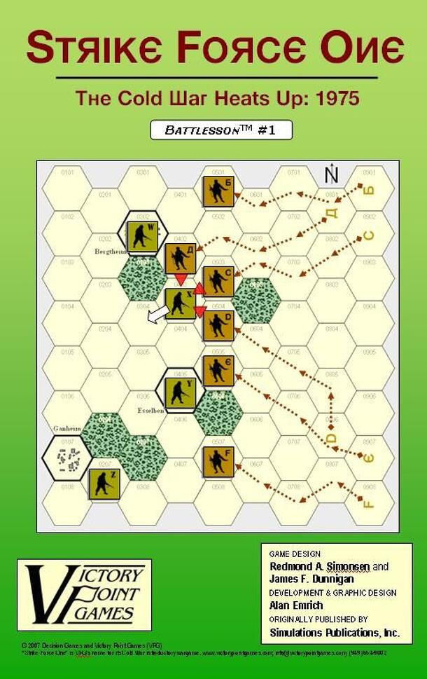 Strike Force One is an easy-to-use, two-player game designed to introduce the concept of "Conflict simulations." Designed as an introductory game to be given away at conventions and as a promotional item, the game consisted of a folder with map, Combat Results Table, small counter sheet (with 10 units) and rules. Also provided was a complete turn-by-turn...