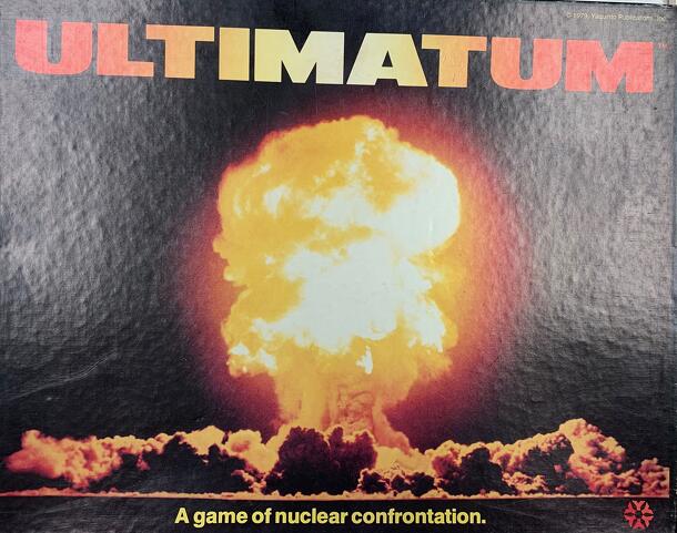 "A game of Nuclear Confrontation". One player plays the Soviet Union and the other the United States. Each player invests in nuclear weapons technology, world "crisis" regions, and nuclear and anti-nuclear weapons (Missiles, Bombers, SSBNs, Interceptors, and ABMs). Units are deployed on the board, leaving some vulnerable to "first strike" nuclear attacks....