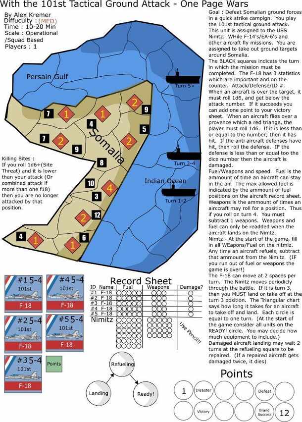From the One Page Wars game series. A simple, abstract game portraying a ground attack campaign by F-18 Hornets. "Goal: Defeat Somalian forces in a quick strike campaign. You play the 101st tactical ground attack. This unit is assigned to the USS Nimitz. While F-14's/EA-6's and other aircraft fly missions, you are assigned to take out ground targets around...